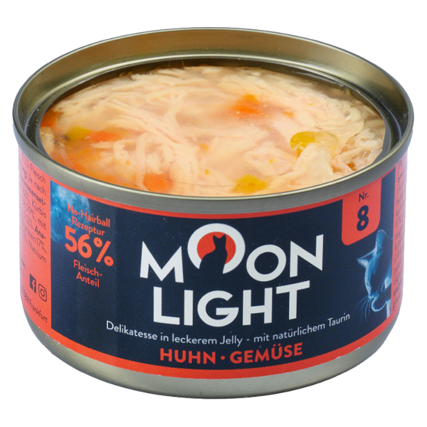 Kurczak i warzywa to składniki niezwykle istotne w menu zarówno ludzi, jak i zwierząt. Obecne pod postacią aromatycznych, sporych kawałków w galaretce, są wprost stworzone do codziennego karmienia twojego kota. Gdzie je znajdziesz? W mokrej karmie Moonlight Dinner N°8 - kurczak i warzywa w galarecie.